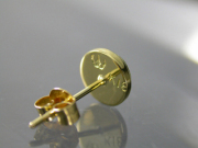 直径7mmのドーム状に成型されたK18金のピアスに守護梵字を彫り込みました。 程よいサイズですので、目立ち過ぎずオススメです。 レーザー彫刻など事は異なり、刃物を使って直接彫り込んでありますので、こすったり磨いたりしても消えることはございません。半永久的にお楽しみ頂ける彫りの深さです。