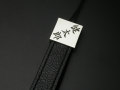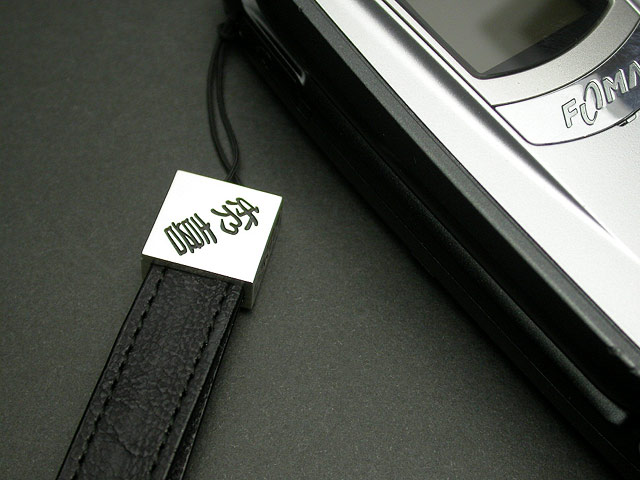 粋な江戸文字を千社札のように斜めに彫り込んだ携帯ストラップです。