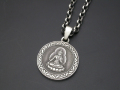 彫銀独自の技法で施されたレリーフの周りには仏像の台座部分に見られる文様を施しており、デザイン性にも優れたペンダントです。