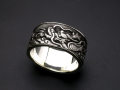 武士の魂とも言える刀の装具の一部である「縁頭」を当時の風合いを損なわぬようにリングへと造り変えました。 荒々しさと繊細さ兼ね備えた仕上がりは当時の職人の息遣いが聞こえてくるかのようです。 大海原を泳ぐ龍をモチーフにしたこのリングは平穏な時代にあっても武士の心意気を忘れていない、そんな思いが込められているのでしょうか…