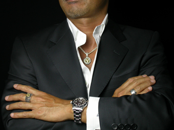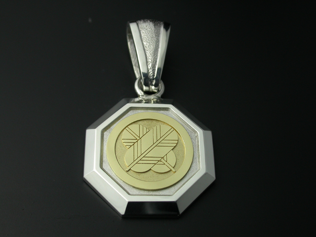 シャツの隙間からチラッと見えるゴールドの輝きが大人の男を引き立たせます。 K18ゴールドの円柱状エンブレムに家紋を彫刻し、シルバーの八角プレートにはめ込みました。