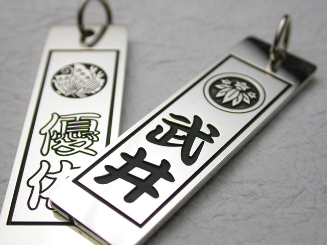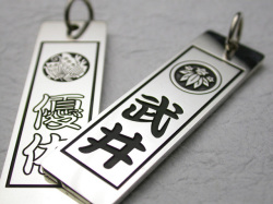 | 古くから日本に伝わる紋章である家紋とお好きなお名前を彫刻した千社札です。 木札の千社札にはない高級感に溢れております。 彫刻希望の家紋は選択項目よりお選び下さい。また彫刻希望のお名前は下記の「彫刻する名前」の欄に直接ご入力下さい。(ご入力頂いた内容で彫刻しますのでお間違いの無いようにご注意下さい。作業開始後の変更は出来かねます。) ※ お名前は3文字までは綺麗に配置する事が可能です。それ以上の文字数の場合、千社札と文字のバランスが少しおかしくなりますのでご了承下さいませ。
