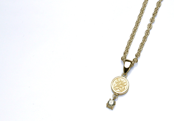 K18金ゴールドの小さなプレートに家紋を彫り込んだペンダントです。 家紋を彫り込んだプレートの下側には0.1カラットの最高級グレードダイヤモンドが揺らめきます。 普段の暮らしの中でちょっとエレガントに「家紋」を感じて欲しいとの想いを込めて作りました。