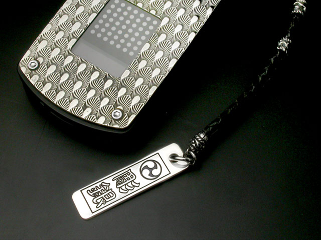 三つ巴千社札ペンダント 携帯ストラップバージョン 三つ巴千社札ペンダント モデルカット