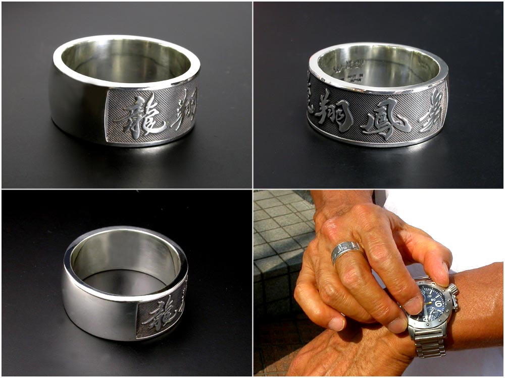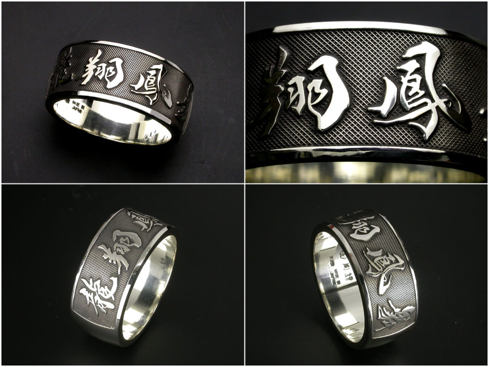 四字熟語「龍翔鳳舞(りゅうしょうほうぶ)」を浮き彫りで表現したシルバーリングです。 グラデーションのような絶妙な輝きは熟練職人の丁寧な仕事の証です。 リング幅:10mm 文字違いのリング、ペンダントもございます。 |