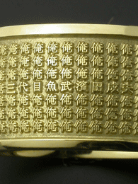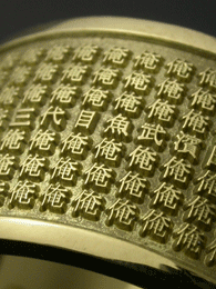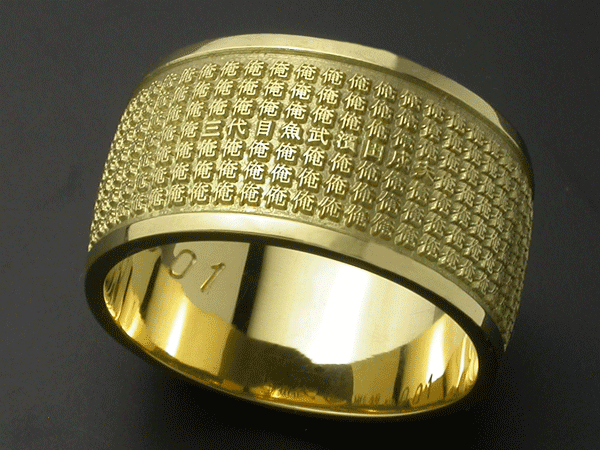 なんと!278個もの「俺」の文字が(1文字の大きさが、0.9mm!)すべて凸彫りで彫刻してあり、同じく中心に彫刻された「三代目魚武濱田成夫」の文字を囲む様にして規則正しく278コ刻まれています。正に魚武の大胆な発想が生んだ最新の「三代目魚武濱田成夫・俺リング」であり究極と呼ぶにふさわしい魚武形見作品となっております。 この[278俺リング]には、シルバー950製の物と、K18金製の物とが存在します。三代目魚武濱田成夫本人は、いつも必ず、そのどちらかを右手の指にはめており、そして同じ指には[俺こそが俺リング](これもシルバー950製とK18金製が存在します)を必ずセットで、並べてはめています。