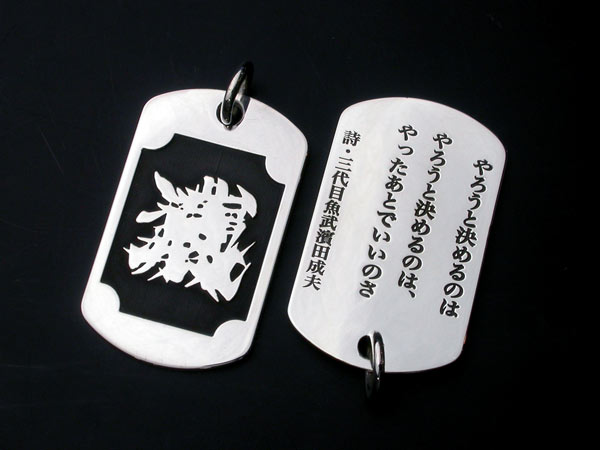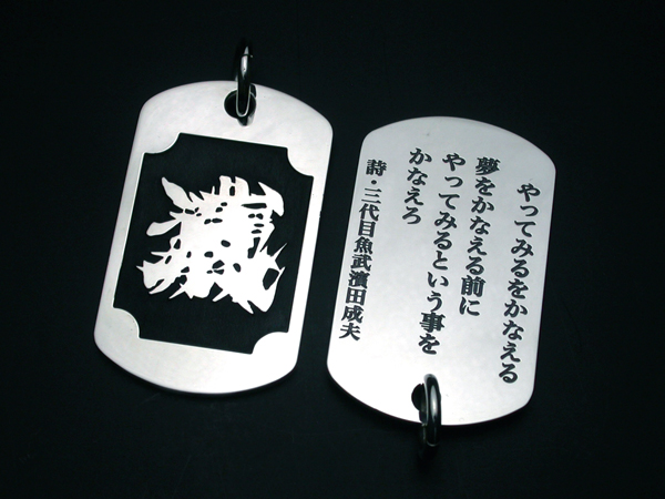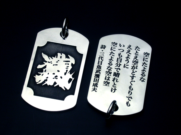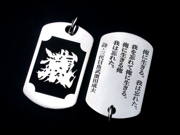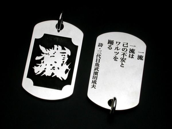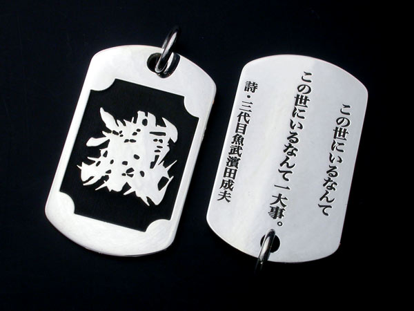 表面には魚武モノグラムマーク、裏面には魚武の詩を彫刻した彫銀制作によるシルバー製の「魚武詩札」です。表面に浮き出た魚武モノグラムマークの周りには、江戸時代から続く伝統技法「魚々子(ななこ)」文様が施されています。「魚々子」とは魚卵を模した文様で、半球状の小さな珠を連続模様で彫刻する高度な技術です。かつては日本刀の鍔などによく施された日本独特の技法でした。江戸金工の末裔である「彫銀」が江戸時代より受け継いだ伝統技法に加え、最新の彫刻技術を駆使して一珠の直径がわずか0.2mmと江戸時代にはなし得なかった世界最小レベルの魚々子模様に挑戦した逸品です。そして裏面には、魚武の詩が彫刻されています。魚武自身の発案により、この「詩札」を身につけた方自身が、首から下げた状態で、いつでもこの詩を読めるようにするため、あえて文字を逆さまに彫刻しています。(「一俺」を除く)この詩は他人に見せるためのものではなく「詩札」を身につけた方自身が、いつでも、どんな時でも読めるためのものであるわけです。魚武曰く「この詩札は俺の詩集からの、詩のシングルカットという発想であり、さらには詩の御守り、つまり詩守りという発想である。」。