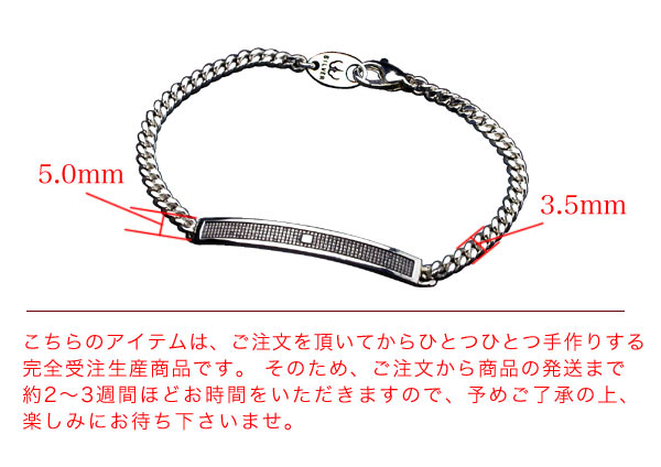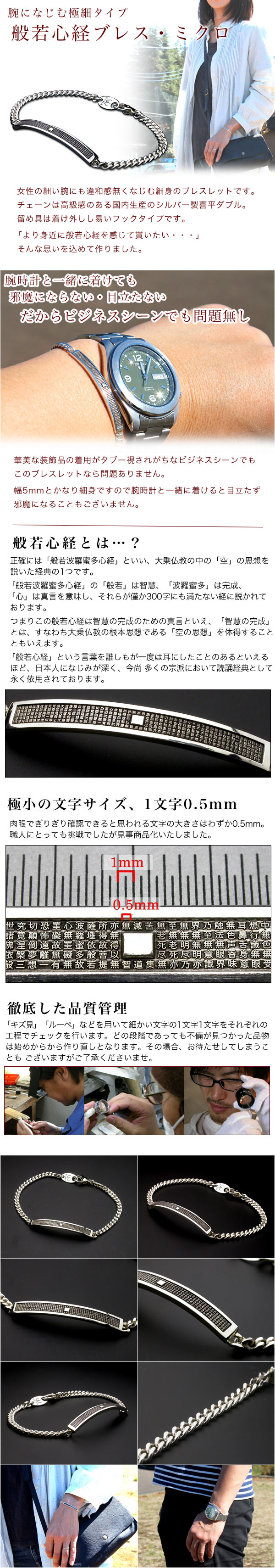 女性の細い腕にも違和感無くなじむ細身のブレスレットです。 チェーンは高級感のある国内生産のシルバー製喜平ダブル。 「より身近に般若心経を感じて貰いたい・・・」 そんな思いを込めて作りました。 また華美な装飾品の着用がタブー視されがちなビジネスシーンでもこのブレスレットなら問題ありません。 幅5mmとかなり細身ですので腕時計と一緒に着けると目立たず、邪魔になることもございません。 1文字のサイズはわずか0.5mm。江戸金工の技を受け継ぐ職人が、般若心経276文字すべてをこのサイズで彫り込んでおります。 般若心経の「空」の教えを表現した中央部分にはダイヤなどの石を留めることも可能です。 プレート部分の材質はシルバー950を使用しており、シルバーアクセサリーによく使われるシルバー925に比べ銀の純度が高く、変色しにくいのが特長です。 また圧延材と呼ばれる、圧力をかけて延ばした地金を使用しておりますので、地金の密度が高く傷が付きにくくなっております。 チェーンには国内生産の高級シルバー喜平ダブルチェーンを採用。しなやかな動きは高級品の証です。 尚、こちらの商品をお買い上げ頂いた方には文字が大きく見えるように拡大鏡をお付けします。 プレートサイズ:幅5mm・長さ43mm・厚み2mm 1文字0.9mm、0.7mmのタイプもございます。 |